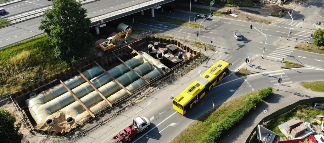 In the face of growing challenges related to climate change and more frequent extreme weather events, cities must invest in modern infrastructure solutions. Katowice, as one of the largest cities in the Upper Silesian-Zagłębie Metropolis, has taken decisive action to protect its residents and infrastructure from the effects of heavy rainfall. One of the key projects in this area was the reconstruction of the rainwater drainage system and the construction of GRP retention reservoirs under the Brynów Junction, completed in 2021. The main objective of the investment was to improve the efficiency of the drainage system and increase hydrological safety in the area of the Brynów Junction. The project was designed to effectively manage rainwater, reduce the risk of local flooding, protect road and urban infrastructure, and increase the city’s resilience to the effects of heavy rainfall.