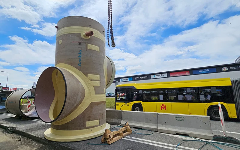 To increase rainwater retention and reduce flood risk in Gliwice, Amiblu GRP pipes and cascade wells were installed in an underground retention channel beneath a main access road, ensuring continuous traffic flow during construction.